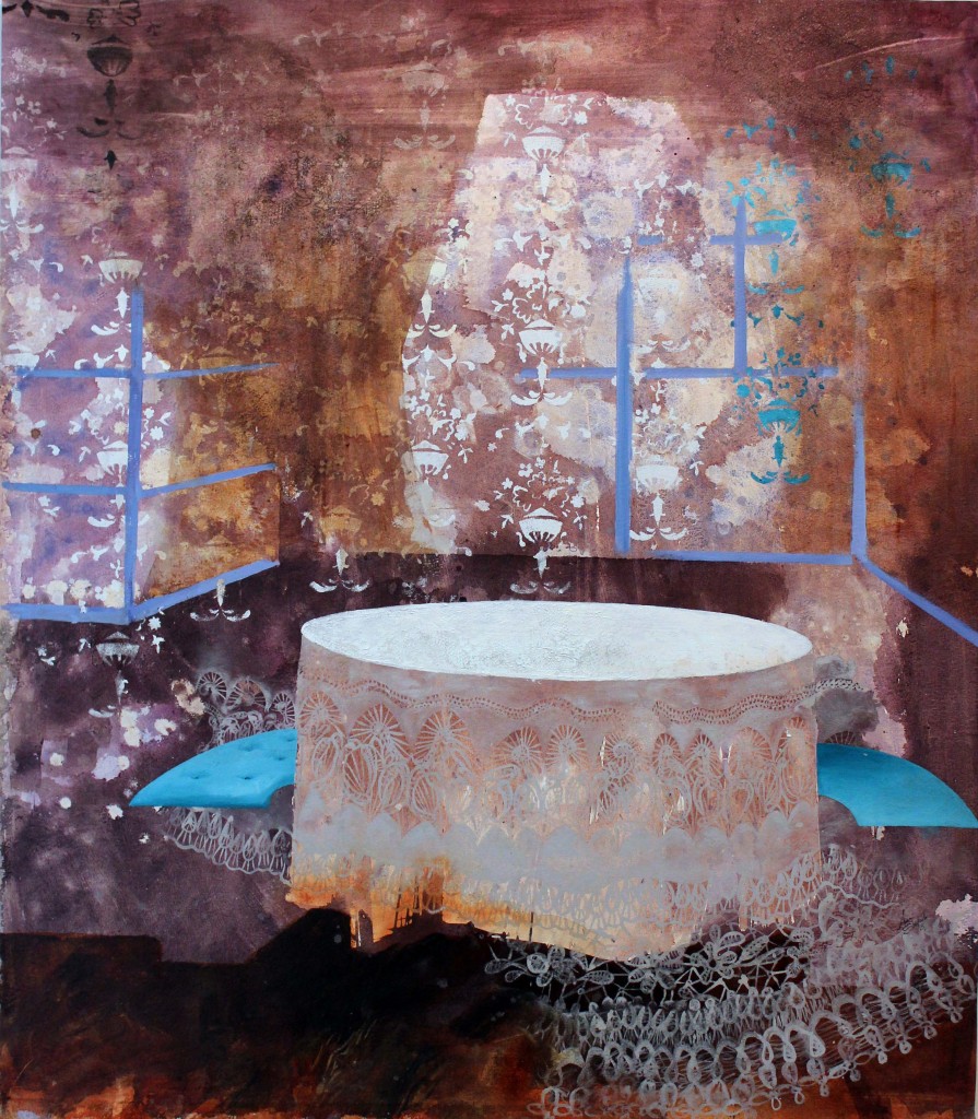 Anna Shukeylo was born in St. Petersburg, Russia and moved to the United States in 1999. Her paintings draw from recollections of her childhood in Saint-Petersburg, Russia. When her family left suddenly for the United States when she was eleven, all that remained was clear but nostalgically haunting mental imagery of her former apartment. Shukeylo’s geographic remove and longing for the dwelling which she can no longer call home create an internal struggle. Such a struggle she is compelled to describe on canvas. Shukeylo pours thinned paint and juxtaposes impasto shapes on top, often in exaggerated color, to create hovering and uneasy optical effects that blur lines of real, remembered and fantastical space. Furthermore, by combining clashing planes and overlaying patterns replete with historical significance to time and place, she creates the sensation of human absence in her work. In her recollections, the energy of vacant apartment rooms still feels inescapably familiar.